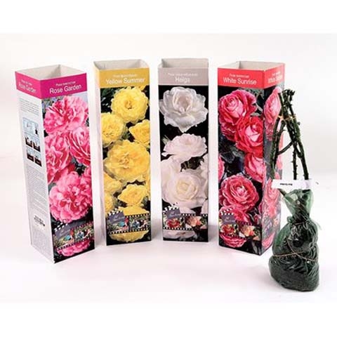 Описание: Роза с упакованной корневой системой, стебли покрыты парафином, в красочной упаковке.