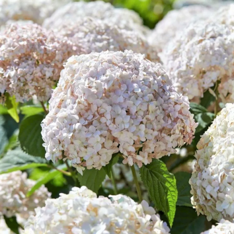 Гортензия древовидная Кандибел Маршмеллоу: куст компактный, высотой 80 см и диаметром 90 см с прочными побегами. Соцветия плотные, нежно-розовые, оригинального «зефирного» оттенка. Цветки розовые, постепенно становятся белыми. Период цветения: с июля по сентябрь на побегах текущего и прошлого года. Листва устойчивая к заболеваниям. Ранней весной рекомендуется обрезка. Морозостойкий. Награждён бронзовой медалью на выставке Plantarium 2019 (Голландия).